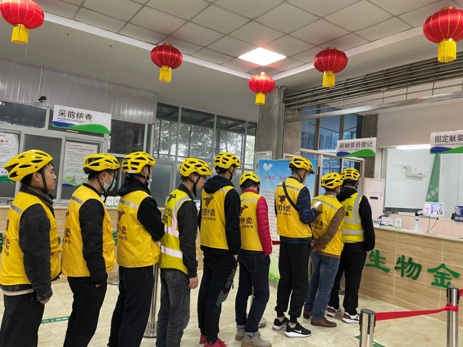 阳春三月,草长莺飞,中国生物金堂血浆站迎来了20余位身穿亮黄工作服的美团外卖骑手,他们此行的目的不是来送餐,而是来捐献血浆,为他人的生命加油助力。