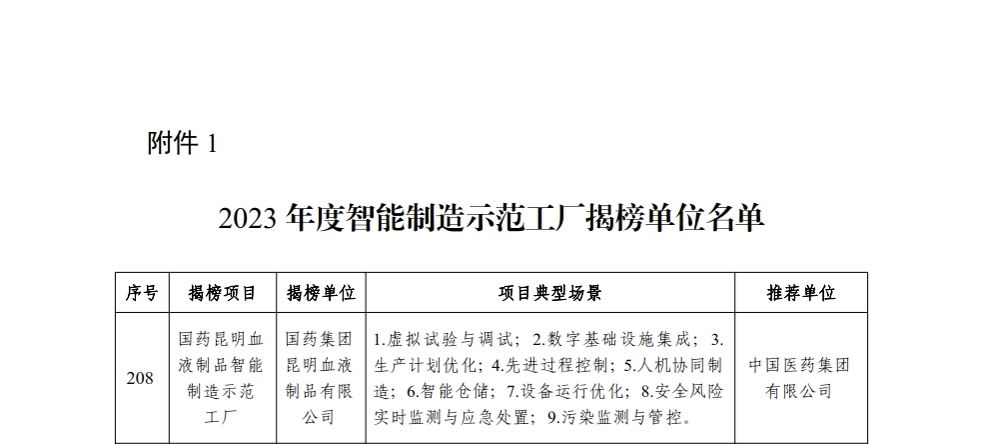 近日,国家工业和信息化部、国家发展和改革委员会、财政部、国务院国有资产监督管理委员会、国家市场监督管理总局联合发布2023年度智能制造示范工厂揭榜单位和优秀场景名单,国药集团昆明血液制品有限公司(简称“昆明血制”)智能制造示范工厂上榜《2023年度智能制造示范工厂揭榜单位名单》,标志着昆明血制智能制造和数字化工厂建设再上新台阶。