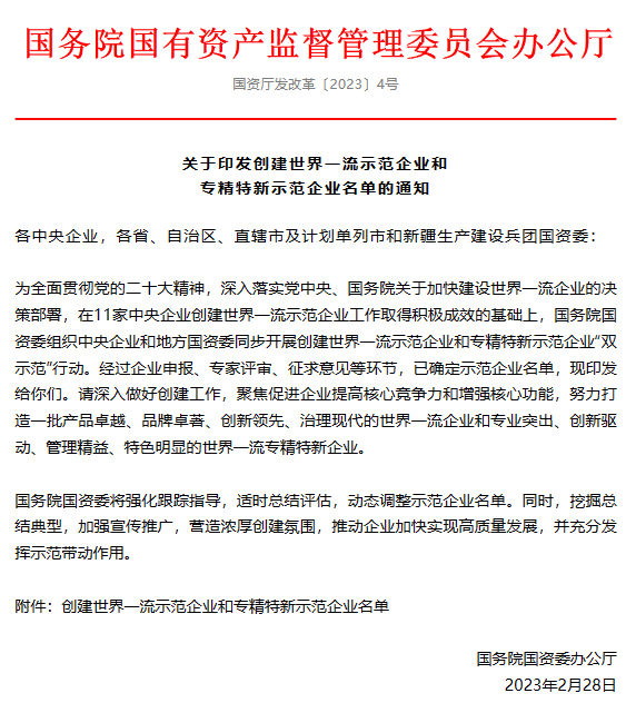 近日,国务院国资委办公厅公布最新创建世界一流示范企业和专精特新示范企业名单,天坛生物入选创建世界一流专精特新示范企业名单,成为全国