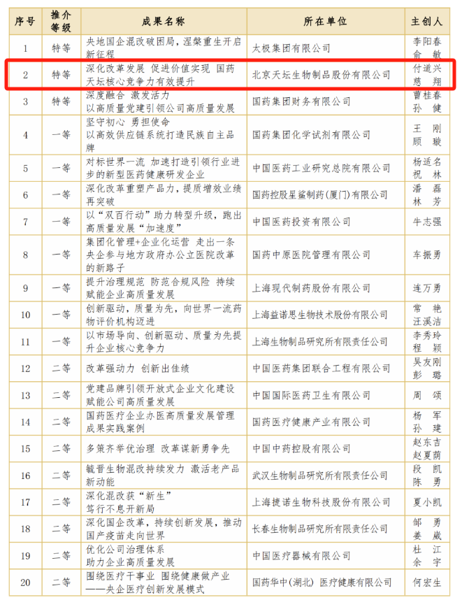近日,第二届(2023)国有企业深化改革实践成果推荐活动评选结果揭晓,天坛生物《深化改革发展 促进价值实现 国药天坛核心竞争力有效提升》荣获特等奖。此次从486项深化改革实践成果中共评出特等成果30项、一等成果50项、二等成果70项。国药集团共有20项改革实践成果入选,其中,获特等奖3项,一等奖8项,二等奖9项。