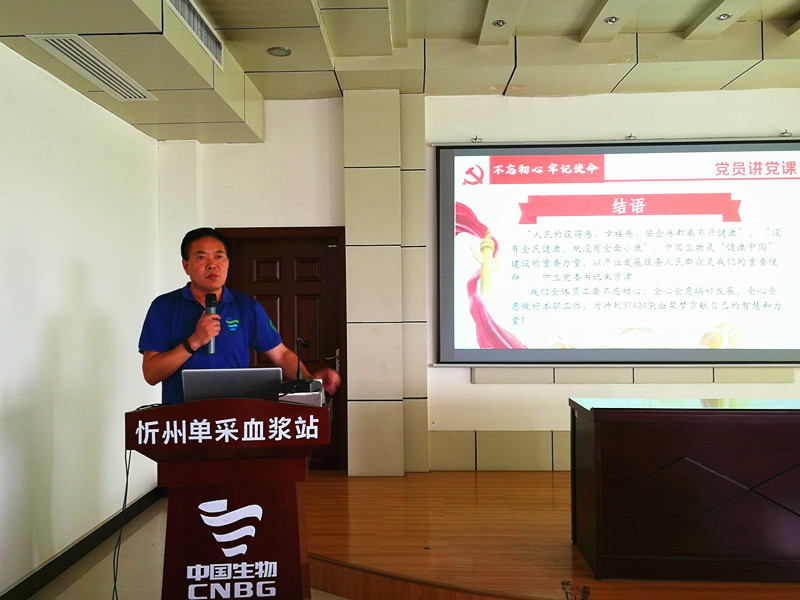 按照支部“党员讲党课”活动安排,忻州浆站站长周皓宇同志作为第一堂党课的授课讲师,他以《不忘初心、牢记使命》为题,从主题教育活动的背景、总要求、根本任务等方面入手,深度解读了主题教育活动的深刻内涵;同时,周皓宇同志对忻州浆站“采浆业务开展现状”、“运营中存在的问题与不足”、“可挖潜提质增效之处”等3个方面进行了剖析,让浆站党员同志和干部员工进一步提高了站位、理清了思路、看清了形势。周浩宇同志还结合自身实际,分享了自己刚到忻州浆站面对复杂局面和困难问题时,是如何不忘初心、牢记使命,一步一步解决难题,竭尽全力不辜负上级组织托付和浆站干部员工信任,最终保障和促进忻州浆站稳步发展。