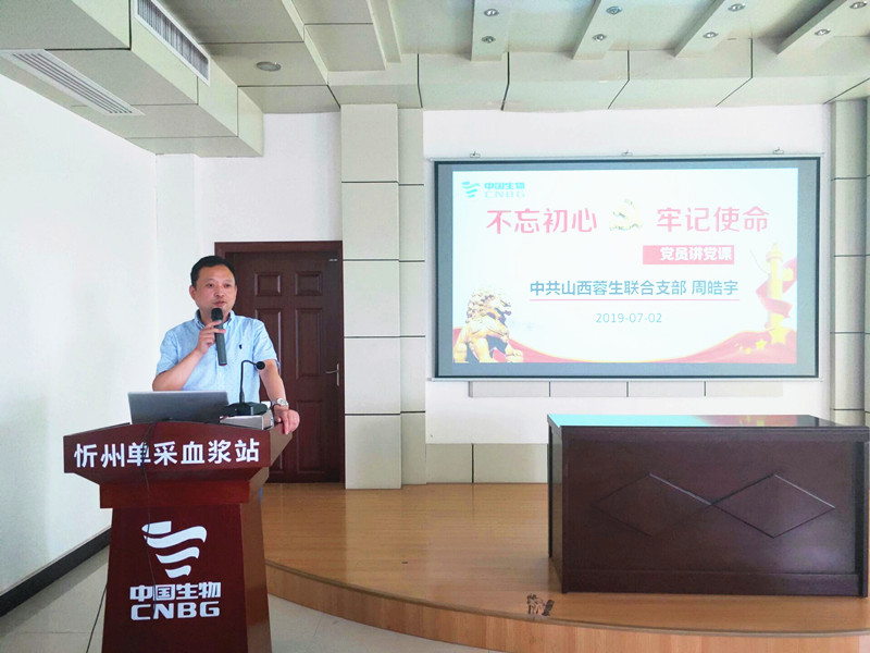 2019年7月1日,在中国共产党建党98周年之际,山西蓉生联合党支部在中国生物忻州血浆站组织开展了建党节主题党日活动,本次活动是自2019年4月3日山西蓉生联合党支部成立以来的第一次主题纪念活动,支部党员、入党积极分子以及浆站青年骨干20余人参加了活动。