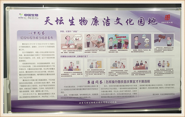 提高认识,使廉洁从业成为常态。近日,天坛生物纪委设计制作廉洁文化园地“廉洁从业”专题内容,以漫画和案例的形式,生动形象地传递坚守廉洁从业的理念,天坛生物本部、各血制公司、各浆站合理利用宣传栏等形式进行警示教育,营造浓厚崇廉氛围,在润物细无声中不断强化廉洁意识。