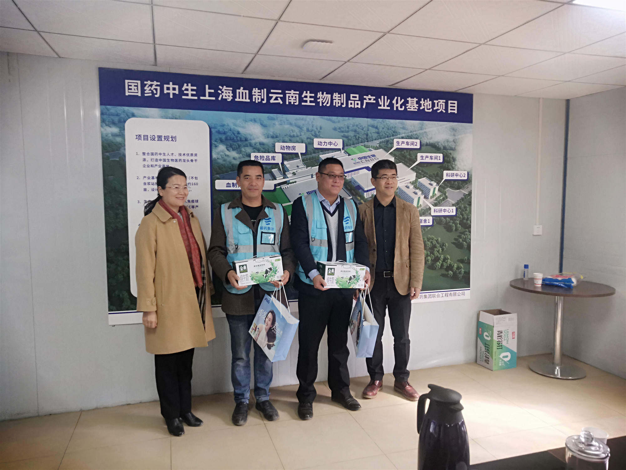 12月15日,中国生物副总裁杨汇川一行到云南项目建设基地调研并慰问天坛生物驻云南项目组工作人员,天坛生物党委书记刘亚娜、副总经理周东波等参加调研。