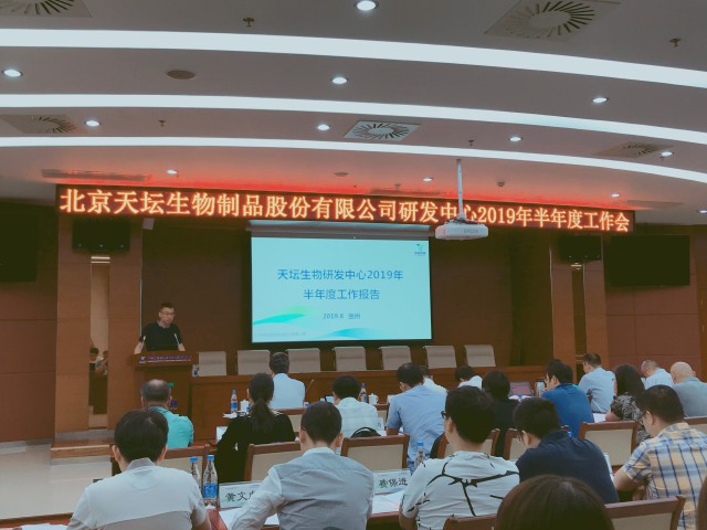 研发中心总经理余鼎作天坛生物研发中心2019年半年度工作报告。报告总结了上半年研发中心运行情况和绩效任务完成情况,并重点针对当前研发中心工作中存在问题提出了解决措施,就未来新产品研发方向进行了思考。
