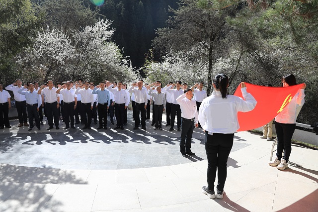 在兴隆山烈士陵园,全体党员干部面对党旗,高举右拳,重温入党誓词。大家瞻仰张一悟烈士纪念亭和无名烈士纪念碑,鞠躬致敬,缅怀革命烈士。