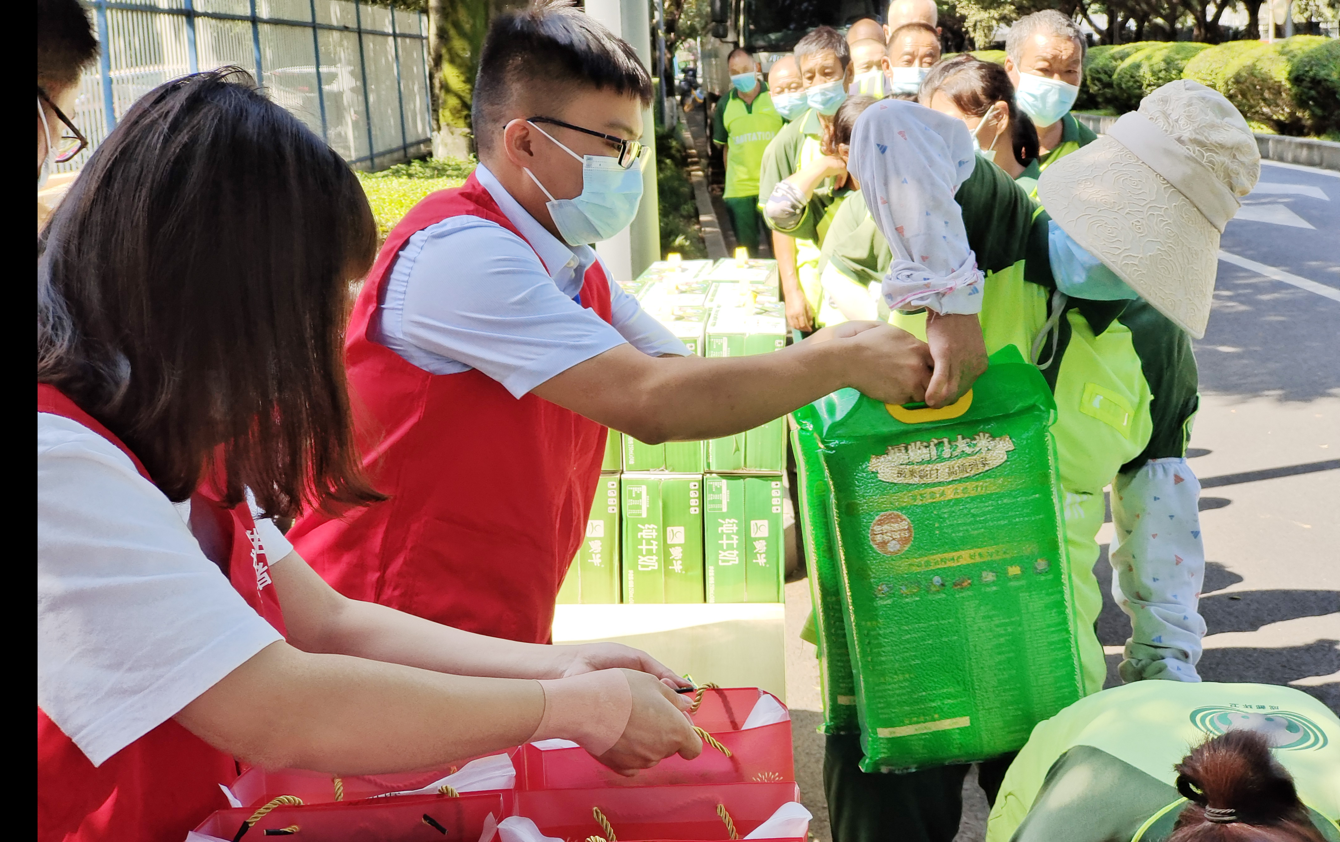 成都蓉生团员志愿者代表向园区环卫工人们转达了公司对他们的谢意,感谢他们对园区环境做出的贡献,就公司设立“爱心小屋”情况沟通交流,并为环卫工人们送上了牛奶、米、日化用品等慰问品。为保障环卫工人在路面清洁时顺利作业,团员志愿者们还整理了公司周围街道停放的共享单车,以实际行动表达对辛勤劳动者的支持与关怀。